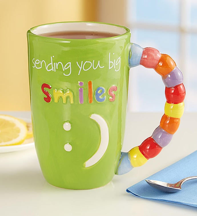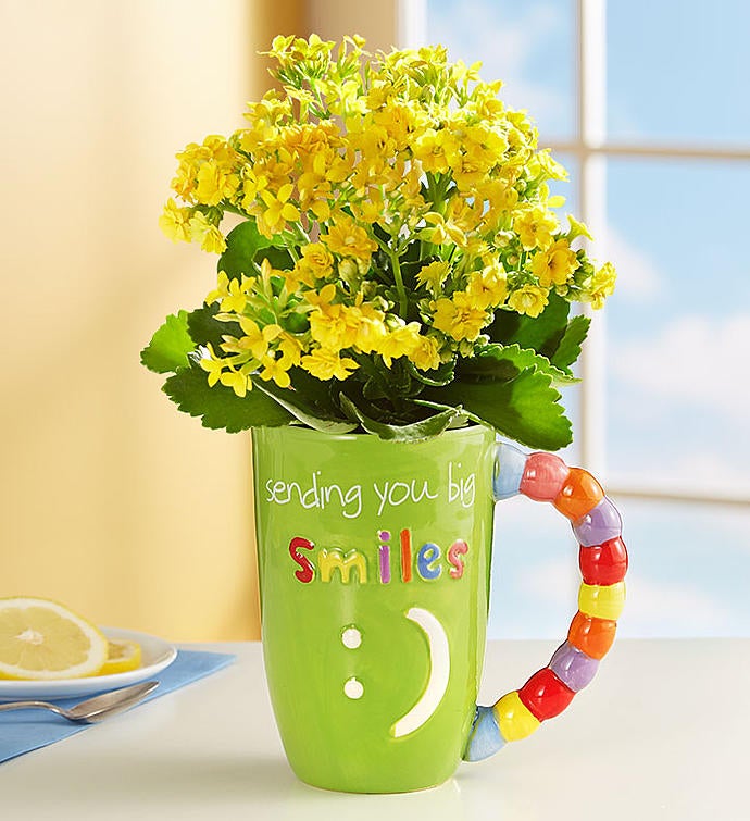 EXCLUSIVE Let our cheerful mug put a big smile on theirs! We’ve tucked a happy yellow kalanchoe plant inside our bright, colorful mug designed by artist, Sandra Magsamen for maximum smile impact. The mug can later be used to hold their favorite drink. For even bigger smiles, add our delicious chocolate chip cookies.