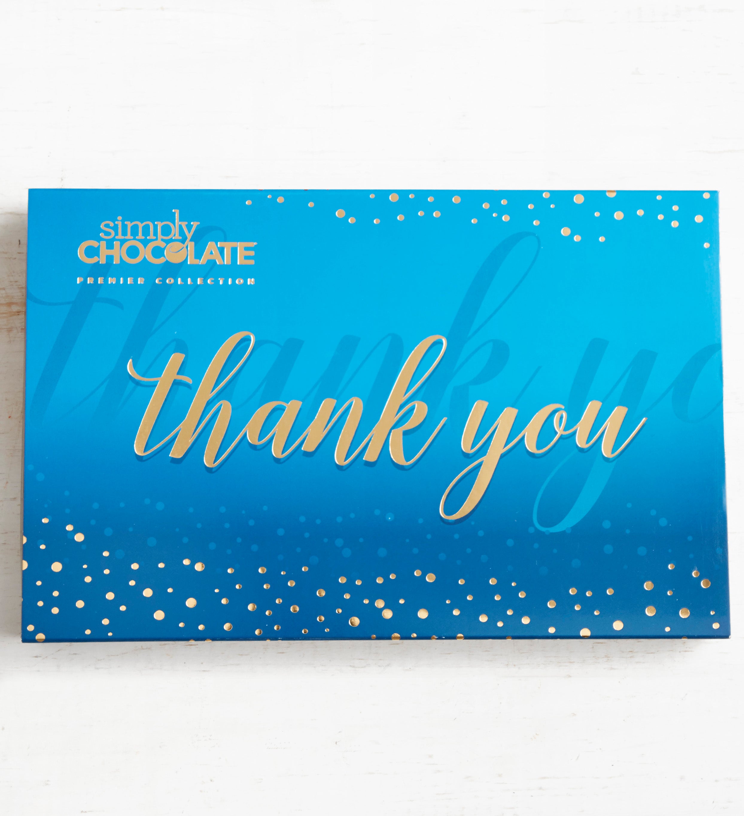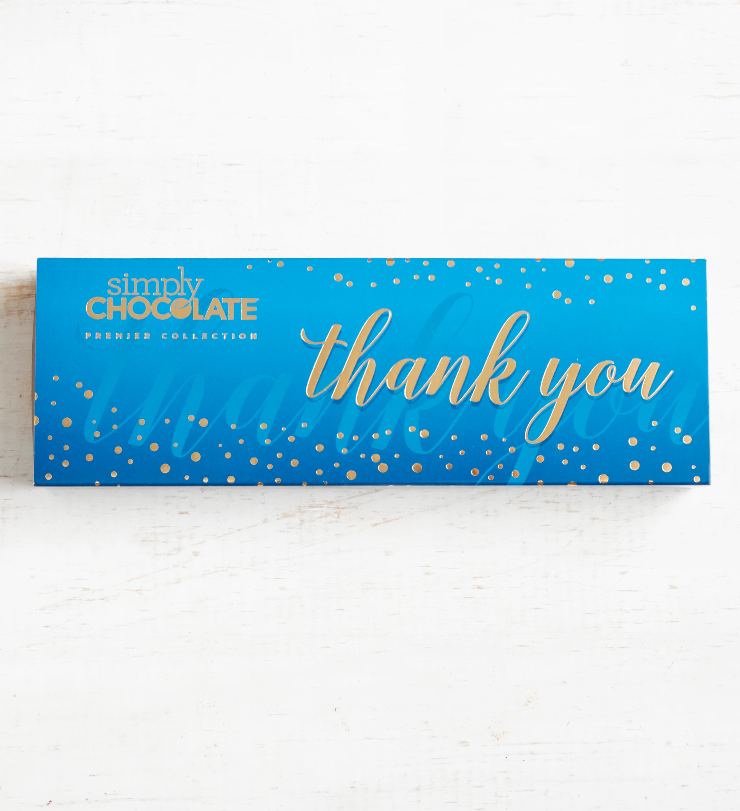 Say Thank You deliciously with this blissful box of chocolates. Our team at Simply Chocolate has spent countless hours working with an artisan chocolatier to perfect this tantalizing assortment. These artful chocolates feature mouth watering flavors like strawberry rhubarb, sea salt peanut butter, mocha cream, hazelnut, and caramel coconut. The Thank You cover slides off to reveal a luxurious gift box. Each piece has a design on top that makes it as good to look at as it is to devour. This is a simply wonderful fine chocolate experience!