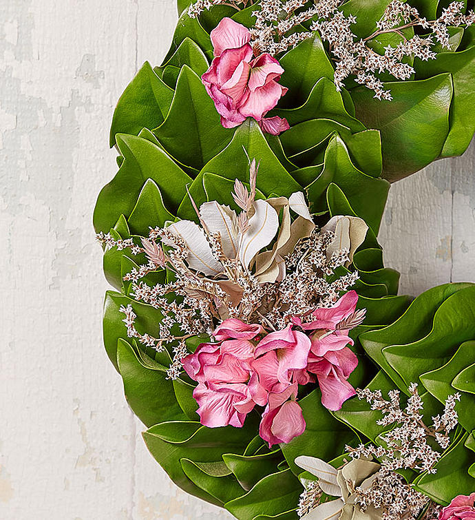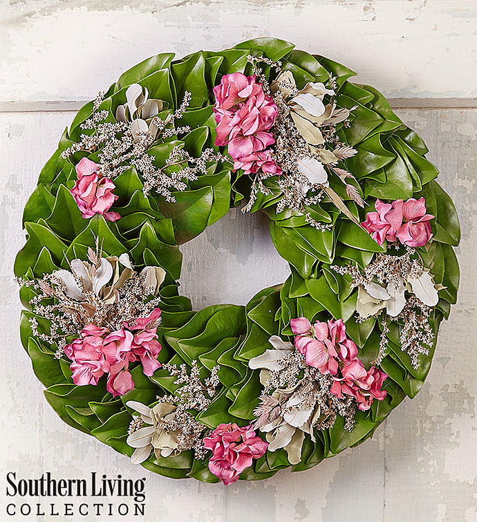 EXCLUSIVE Give family and friends a southern spring welcome with our elegant new wreath. Created exclusively through our partnership with Southern Living, our hand-designed wreath features a base of lush green magnolia leaves, a staple of the South, and touches of preserved pink hydrangea for pretty pops of color. It’s a gift that brings the natural beauty of the season right to their front door.
