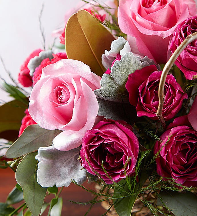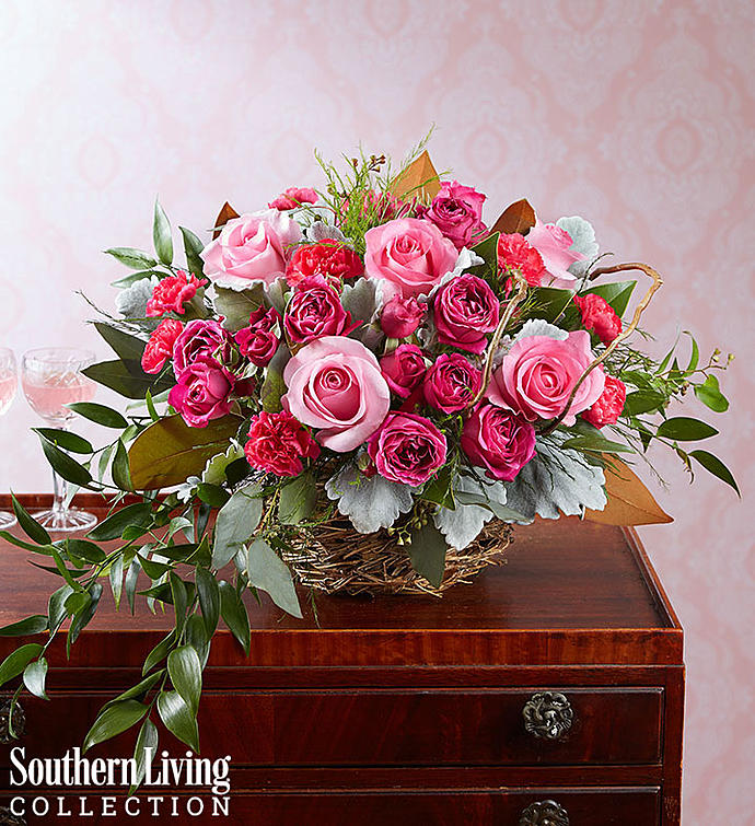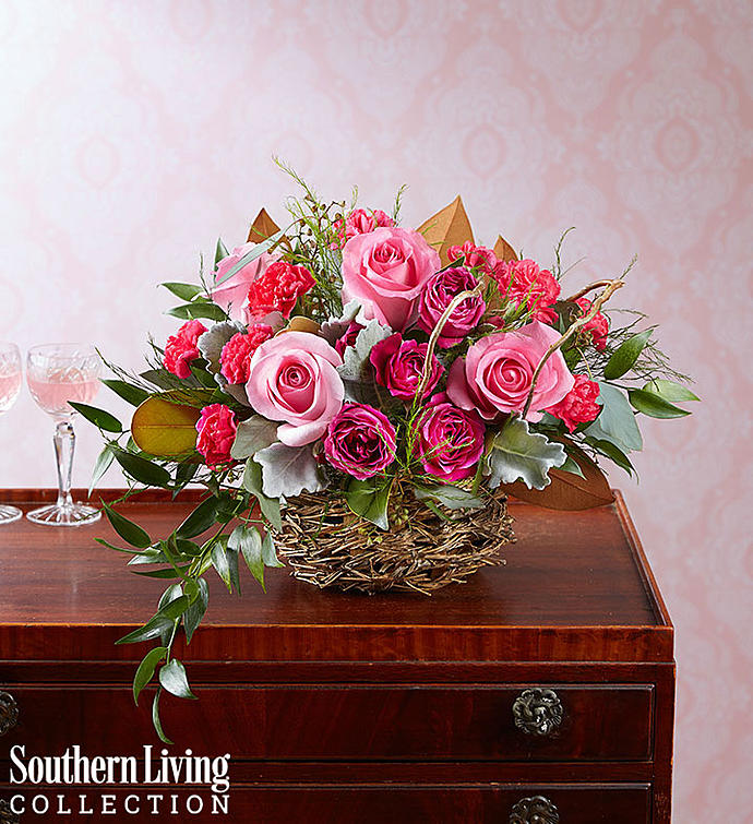 EXCLUSIVE Bursting with lots of rustic beauty and a bit of Southern charm, our new arrangement brings a touch of nature to your nest. Created exclusively through our partnership with Southern Living®, this unique design includes a gathering of pink blooms that pop against a base of lush green accents, looped around in asymmetrical design. It all comes together inside our charming bird’s nest, creating an eye-catching combo of color and texture.