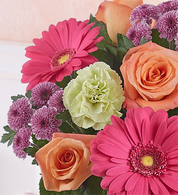 • Bouquet of hot pink Gerbera daisies, lavender button poms, peach roses, and green carnations