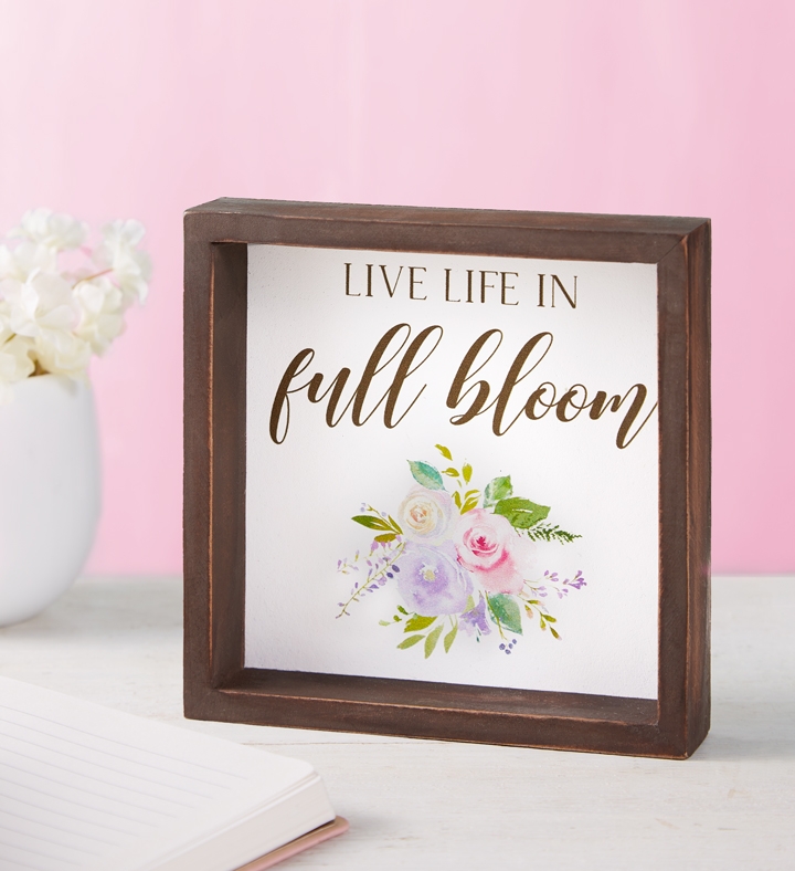 • Natural wood shadow box sign featuring the sentiment “Live life in full bloom”; measures 5"H x 5"W