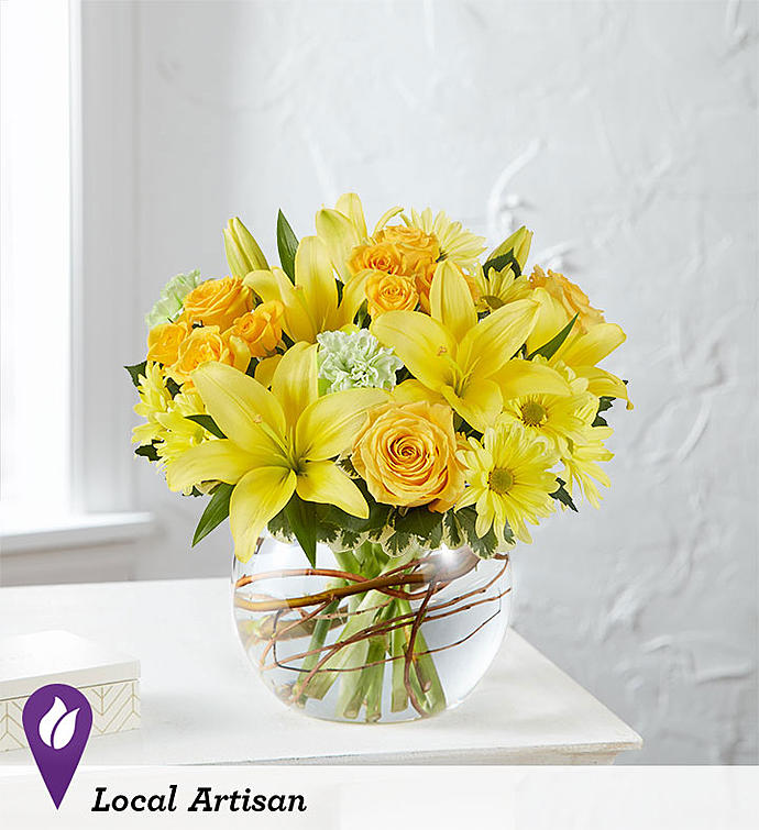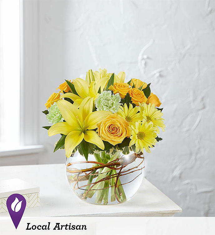 LOCAL ARTISAN Here’s a bright way to send a happy surprise! Our new vibrant bouquet is gathered with cheerful yellow blooms and unique curly willow tips inside a charming, petite bubble bowl. Created by Breanna Cartwright of Modesto, California, it’s the kind of gift that inspires lots of sunny days ahead.
