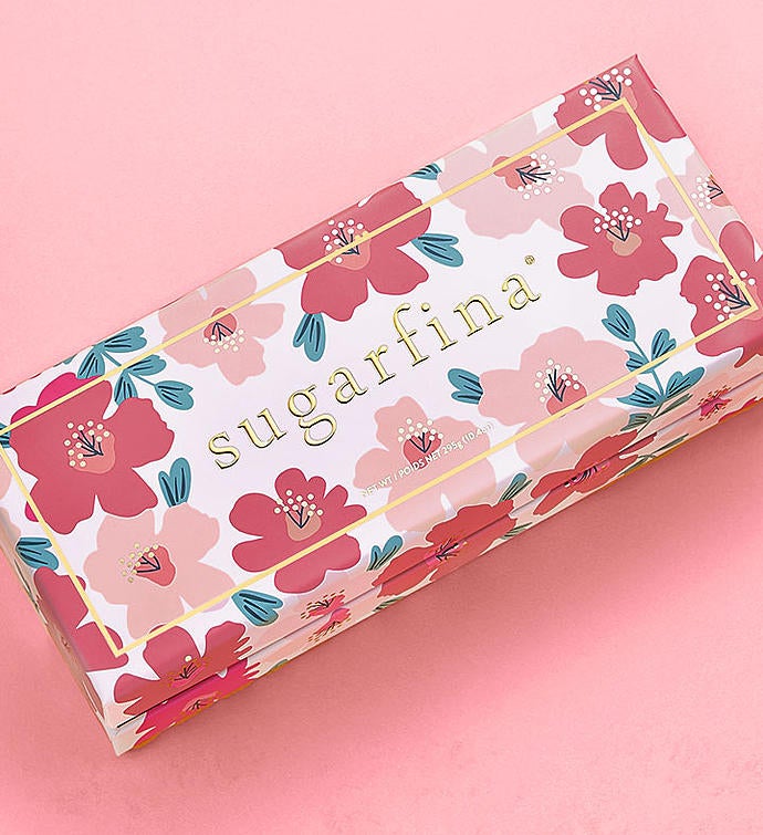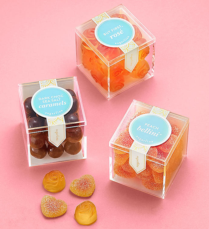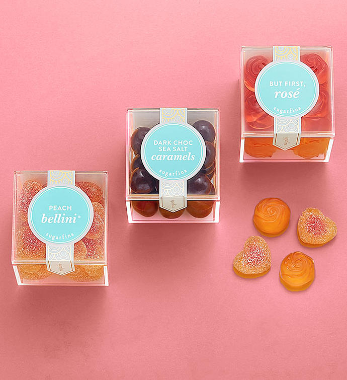 Make birthdays or any day extra special with this beautiful floral giftbox of amazing premium candies. Includes three adorable lucite boxes of Sugarfina's most popular sweets: But First, Rosé Roses, Dark Chocolate Sea Salt Caramels, and Peach Bellini® Gummies. Sugarfina, founded by a couple who love candy and each other, wasnamed one of the world's 50 most innovative companies in 2018 by Fast Company. Celebrate deliciously!