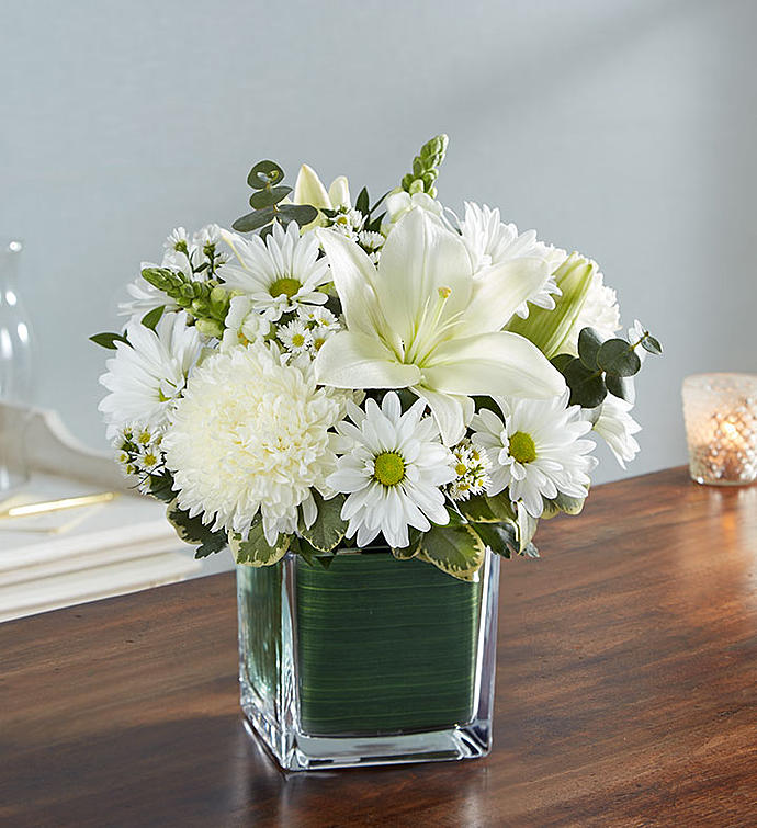 There is an innocence to all souls that is evoked in an expression of pure white. Our sympathy arrangement of angelic white roses, lilies, mums, daisy poms and more, expertly arranged in a clear glass cube lined with a Ti leaf ribbon, makes for an exquisite gesture of comfort and healing.