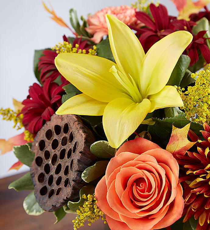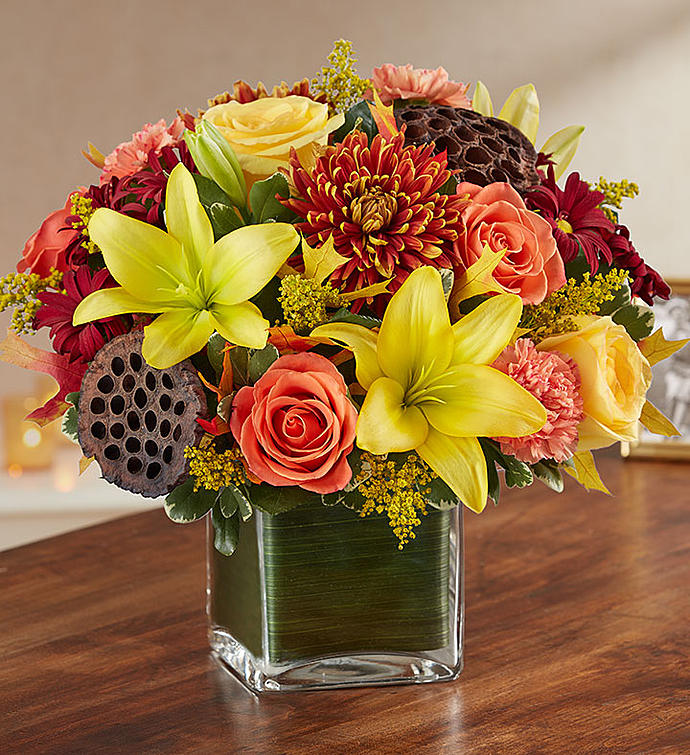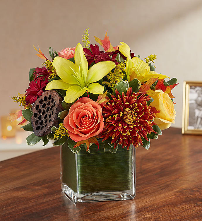 If you can’t find the right words, a beautiful arrangement of flowers can be a touching gesture. We’ve gathered a lush array of autumn blooms inside a cube vase to help you offer comfort and healing during a difficult time.