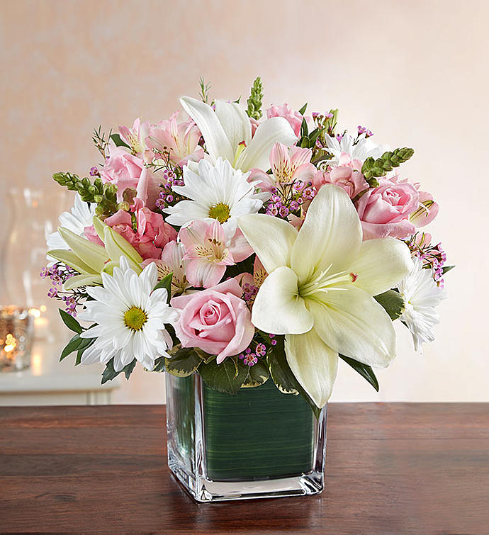 Delicate blooms call to mind beauty, grace and sweetness—a reminder of the dearly departed themselves. Our sympathy arrangement of gentle pink roses and white lilies, expertly gathered in a clear glass cube lined with a Ti leaf ribbon, makes for an exquisite gesture of comfort and healing.