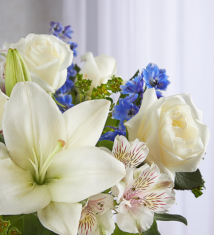 EXCLUSIVE Offer heartfelt comfort and support with our Loving Blooms™ bouquet. Heavenly blue and white flowers are artistically arranged inside our exclusive Lenox® porcelain vase. The touching keepsake features an exquisite raised floral design and a 24 karat gold trim at the base for a beautiful expression of your sympathy.