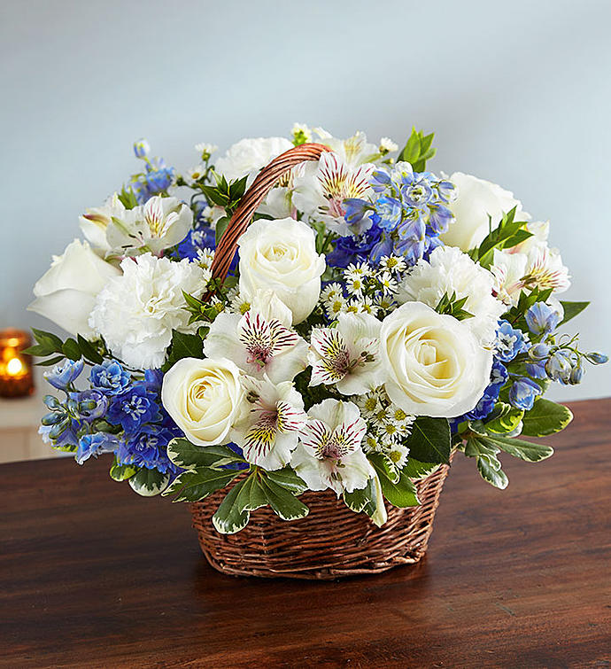 Offer peace and comforting prayers during times of loss with elegant blue and white blooms. Artistically designed inside a keepsake willow basket, our arrangement of heavenly blue delphinium and white roses is a touching way to convey your sincerest blessings.
