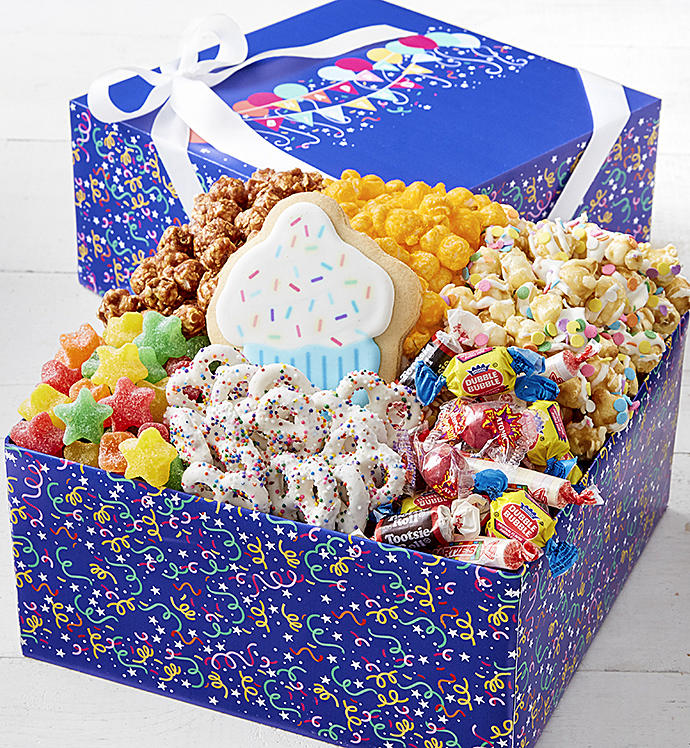 Make their special day extra special with a fun and festive selection of goodies. Sampler Box "sings" the Happy Birthday tune when opened and includes kiddie mix, assorted sour stars, rainbow hostess pretzels, a cupcake shortbread cookie, and 3 flavors of popcorn: Cheese, Chocolate and Celebration Cornfetti.