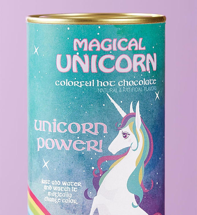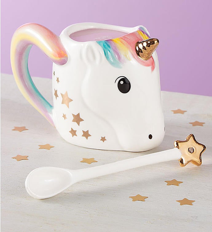 There’s no power like unicorn power! Our whimsical unicorn mug features a shining gold horn, rainbow-painted mane, a tail that serves as the handle and plenty of gold star accents. To stir up the magic, we’ve paired our unicorn mug with a tin of magical pink hot chocolate mix and a matching stir stick topped with a gold star finial.