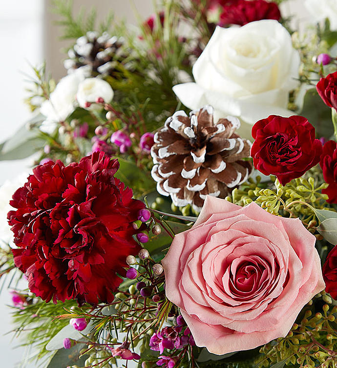 EXCLUSIVE Vintage Victorian meets modern chic. Our charming, rustic winter bouquet is gathered with rich red, soft pink and creamy white blooms together with fresh winter greenery. Designed inside our white faceted ceramic vase with a satin finish, it’s an on-trend way to warm up their winter.