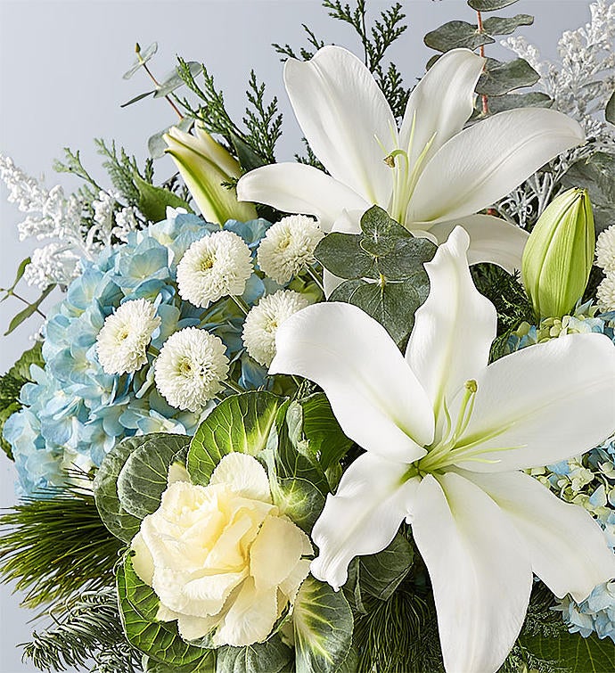 Winter is a magical time of year, and we’ve captured the wonder of it in our luxurious new seasonal arrangement. A grand bouquet of unique floral varieties, including white kale, blue hydrangea, and tinted solidago, handcrafted in a clear glass vase. Like the first snowfall of the season, it’s sure to draw plenty of oohs and ahhs!