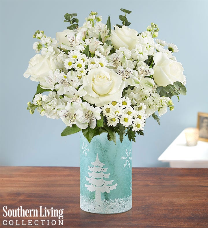 EXCLUSIVE Deliver winter’s captivating beauty with our elegant seasonal bouquet—designed in collaboration with Southern Living. Snow-white roses, lilies and more are gathered in our exclusive soft-blue, frosted vase featuring a magical winterscape design. This heartwarming vase can later be enjoyed as a unique holiday décor piece.
