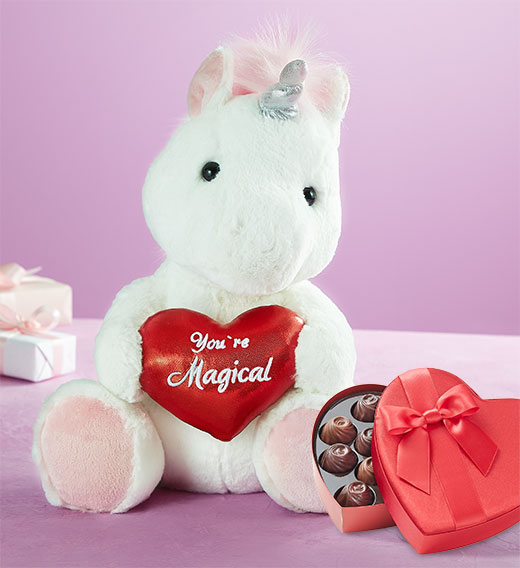 Let them know how magical they are with our fantastical plush gift. Our one-of-a-kind unicorn plush has a fluffy pink mane, shiny silver horn, and a metallic red heart displaying the sentiment, “You’re Magical.” Surprise them with this gift and they’ll be over the rainbow with joy.